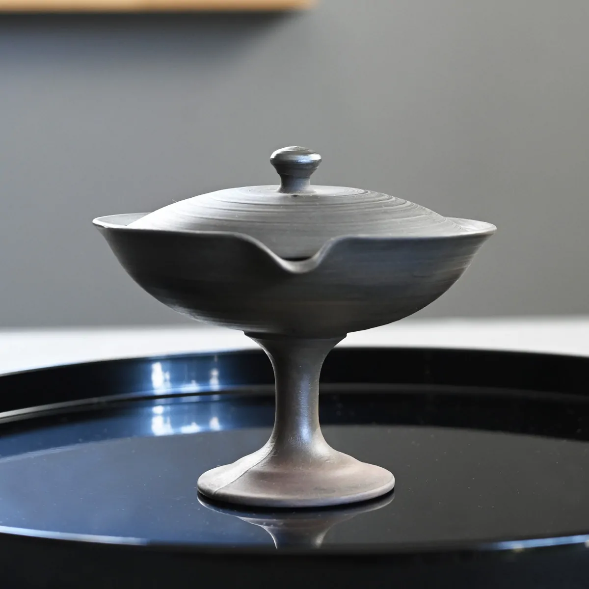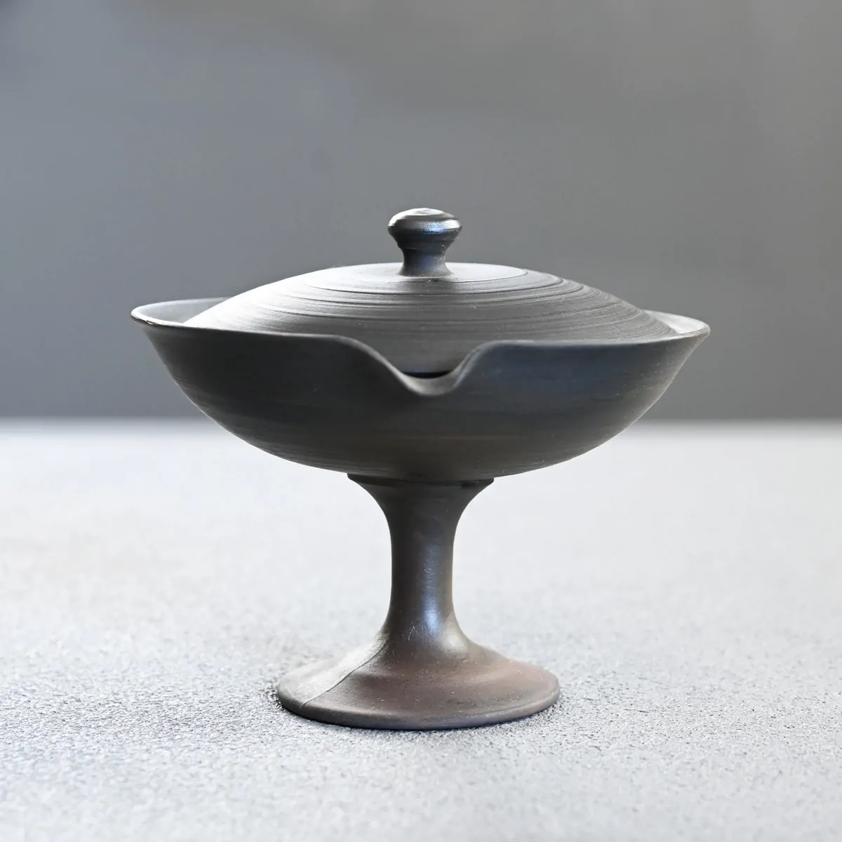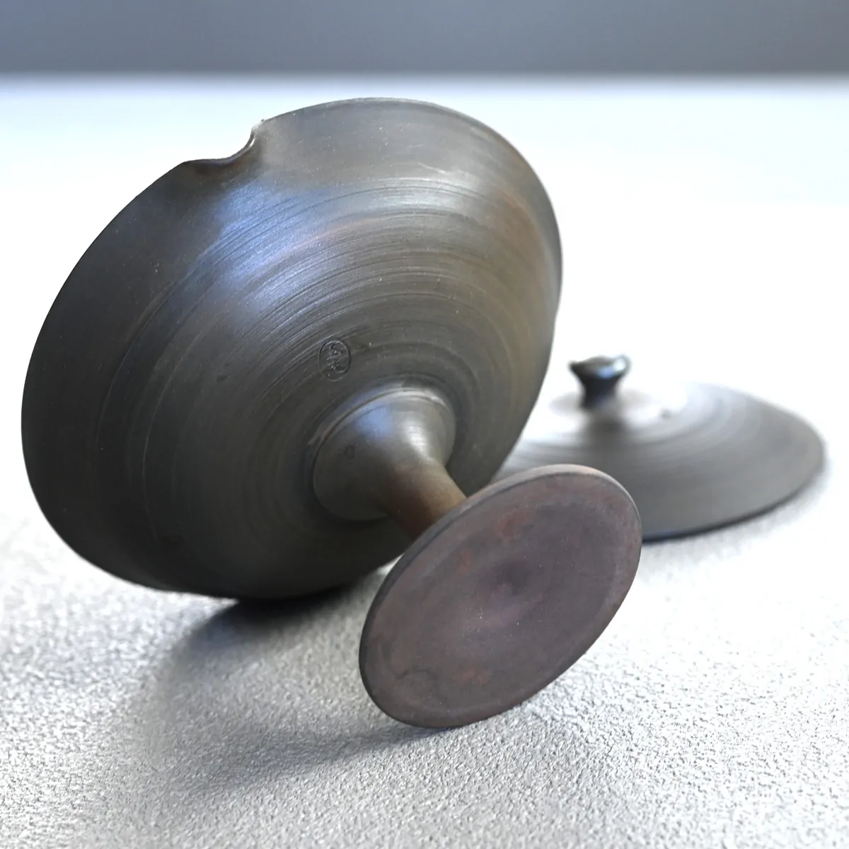 The teapot is made of red clay and fired in a reduction chamber, where the clay carbonizes and gives the surface a matte black patina.