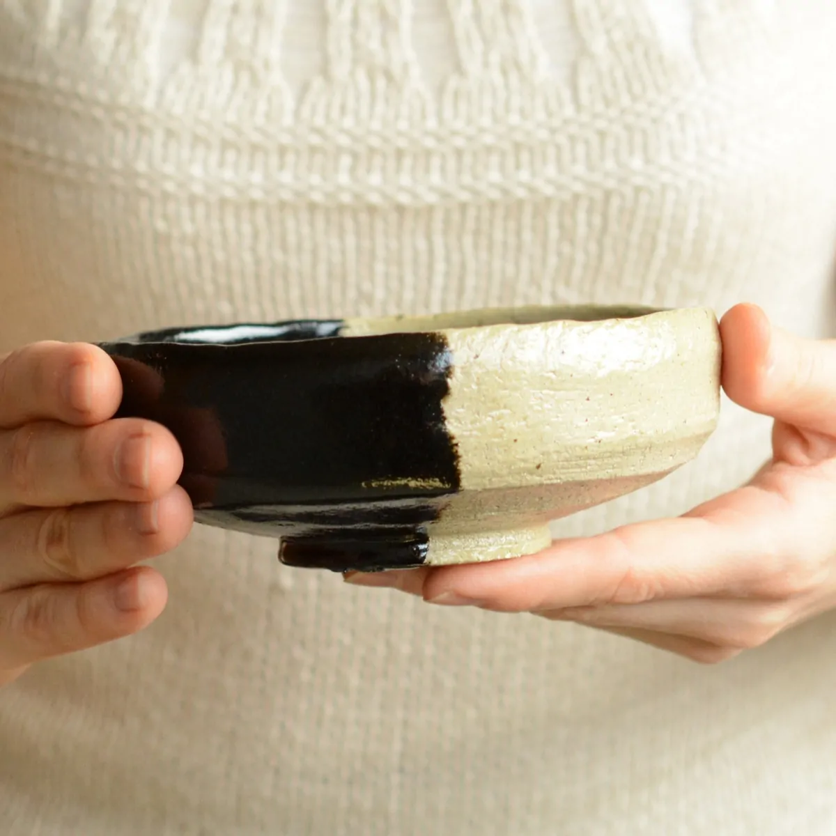 The bowl is coated with ash glaze. The splitting of glaze colors is a renowned technique called "kakewake" and is widely used in Japanese pottery.