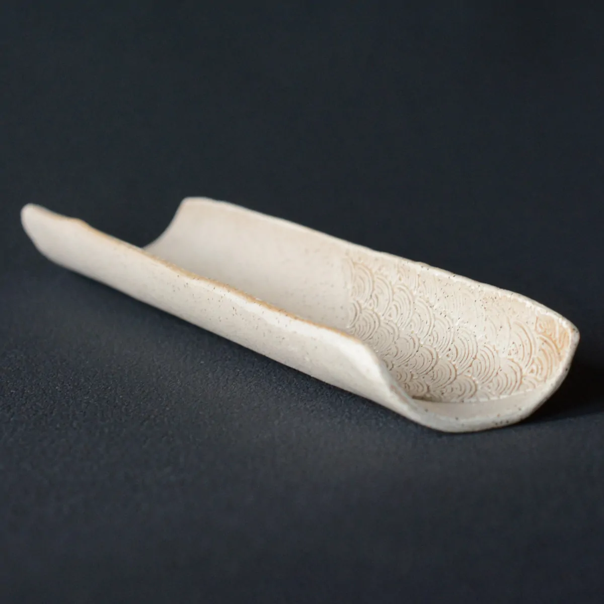 Glazed ceramic tea tool to display tea leaves before brewing. It is made of white clay and decorated with a traditional Japanese wave pattern engraved on the inside and a textile print on the outside.