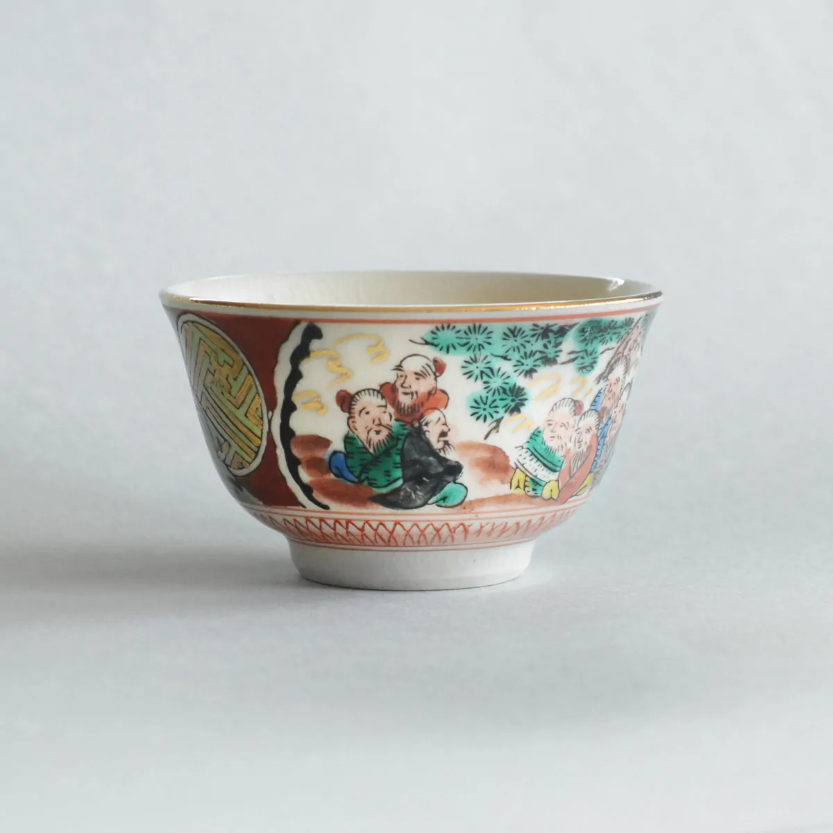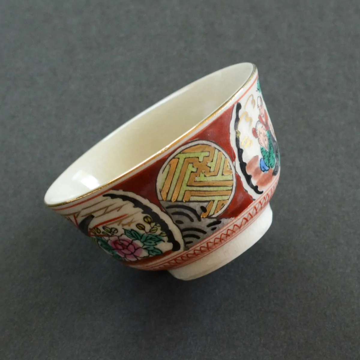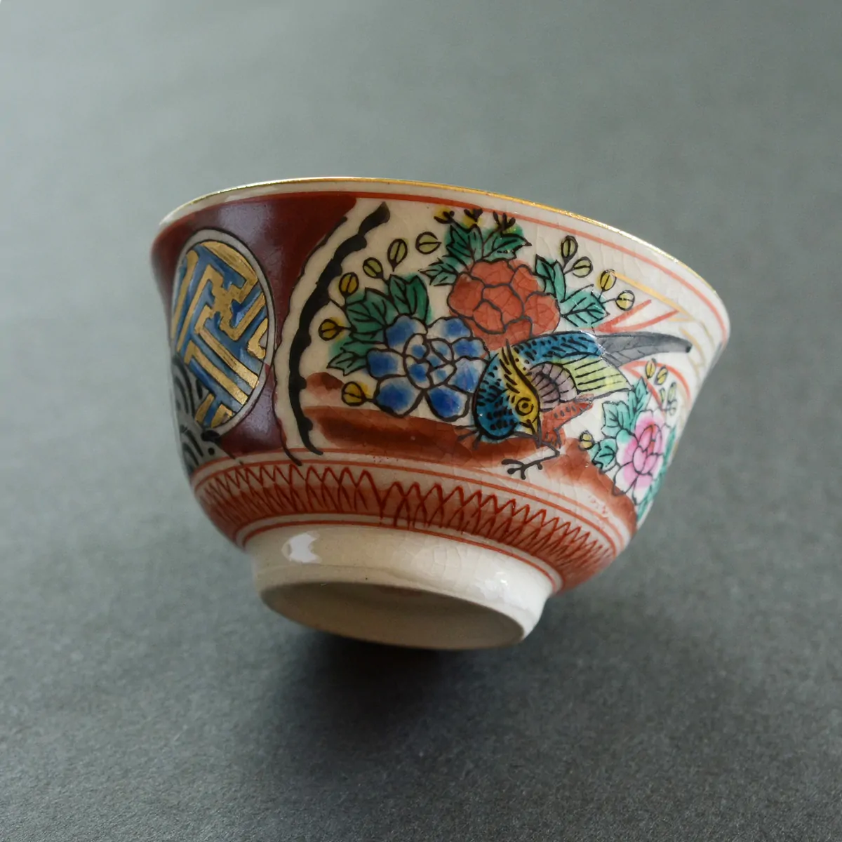 The decoration on this tea cup is called "Saishiki Kinrande" (彩色金蘭手) that usually includes four main motives: imaginary flowers, birds, people, and landscapes. The over-glazing technique used for this cup is called the "Shoza style".