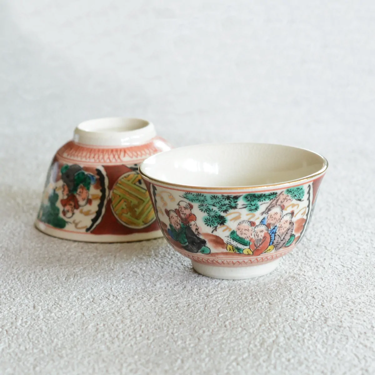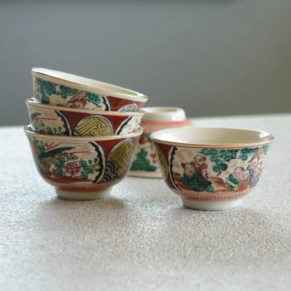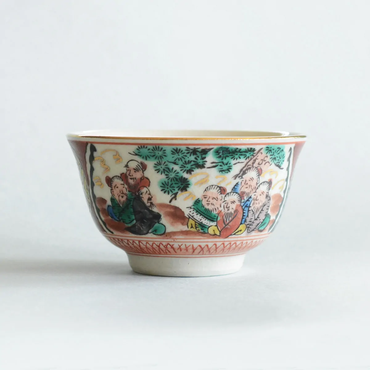 The decoration on this tea cup is called "Saishiki Kinrande" (彩色金蘭手) that usually includes four main motives: imaginary flowers, birds, people, and landscapes. The over-glazing technique used for this cup is called the "Shoza style".