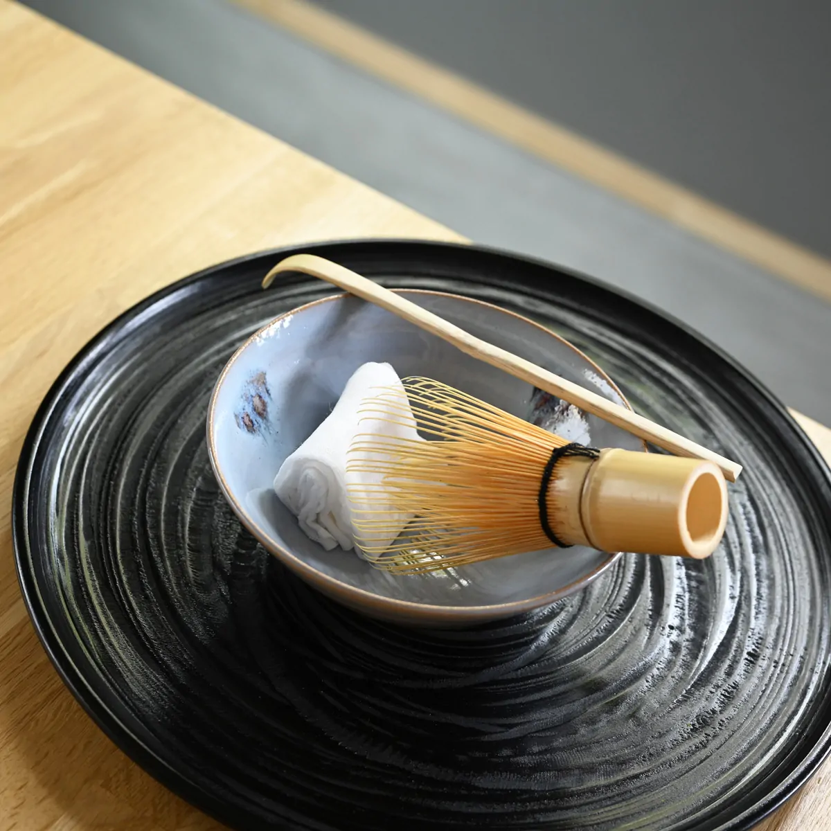 - Place the tea bowl on a non-slippery surface, and hold it on the side with your left hand (if right-handed).