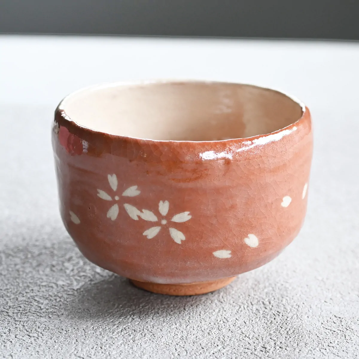 Handmade matcha bowl decorated with cherry blossom and cherry petals.