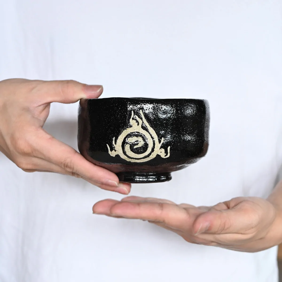 Handmade matcha tea bowl decorated with a white snake.