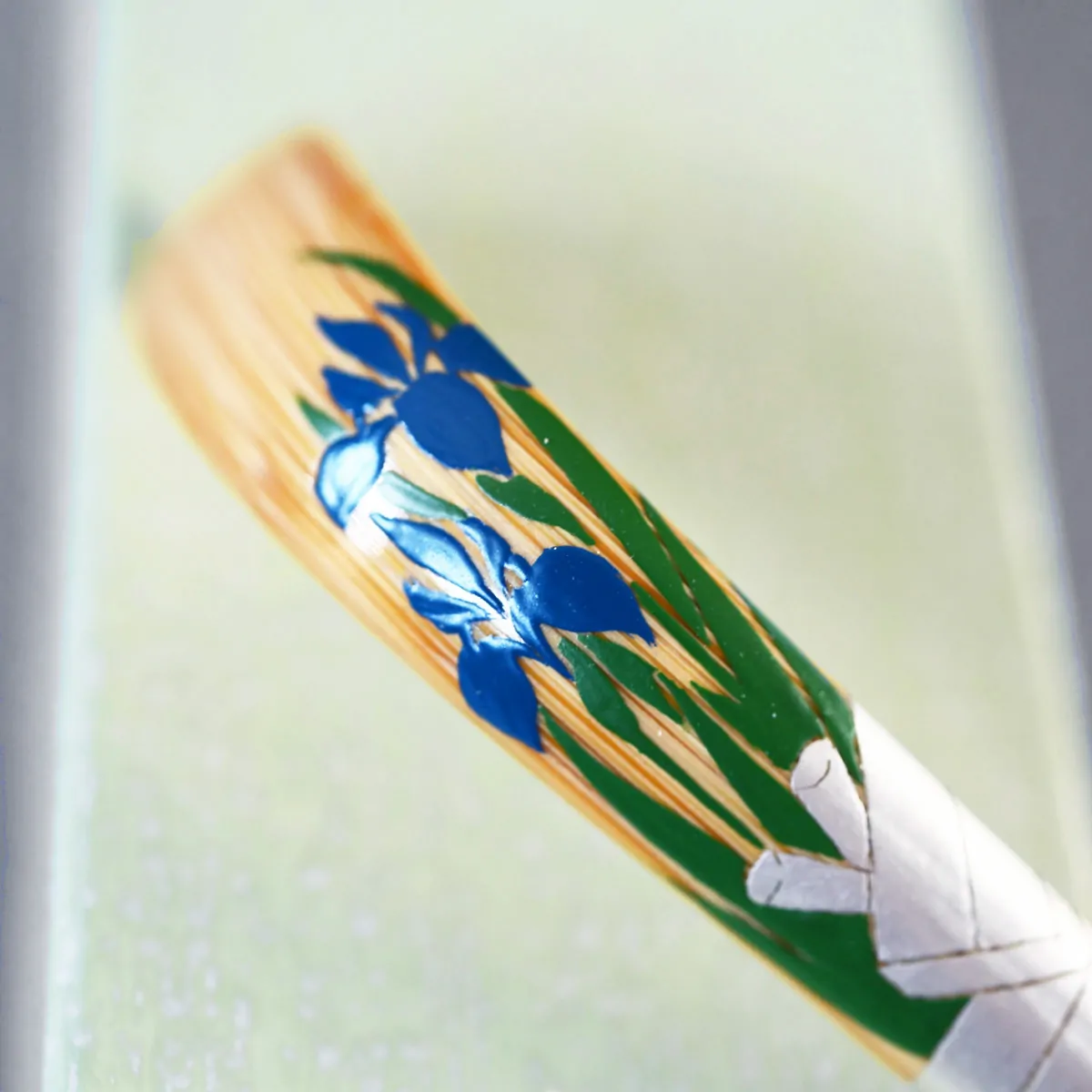 Hand-painted bamboo tea scoop with Japanese water iris flowers