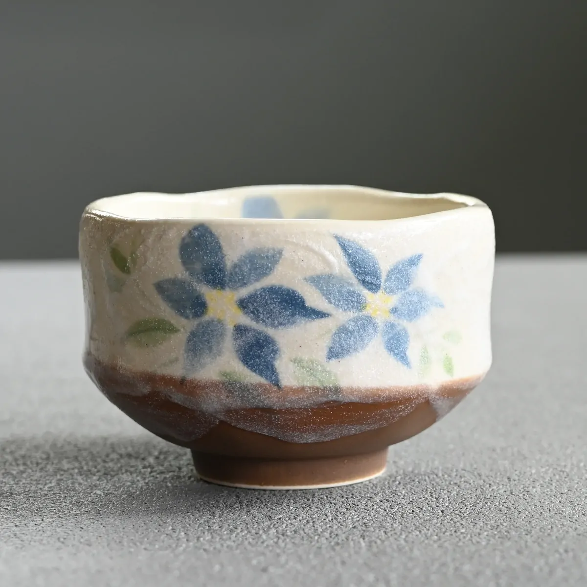 A charming, clay matcha tea bowl decorated with Clematis blossom.