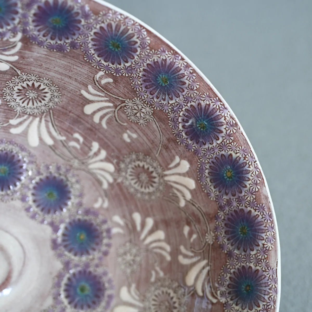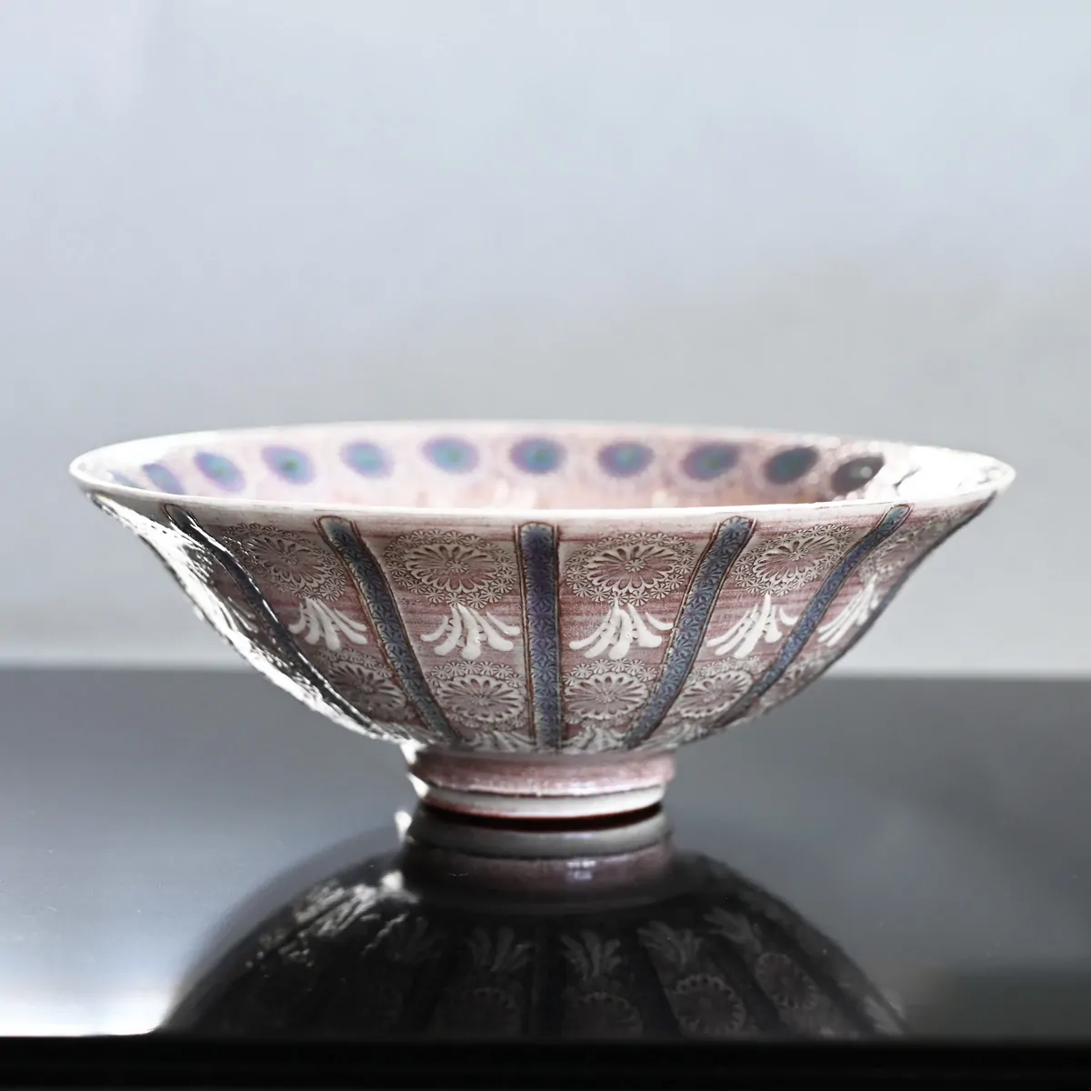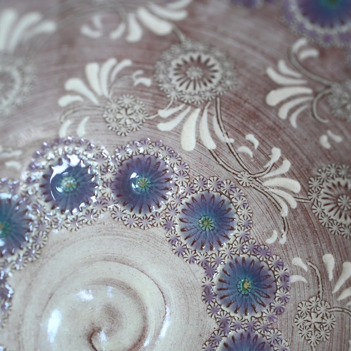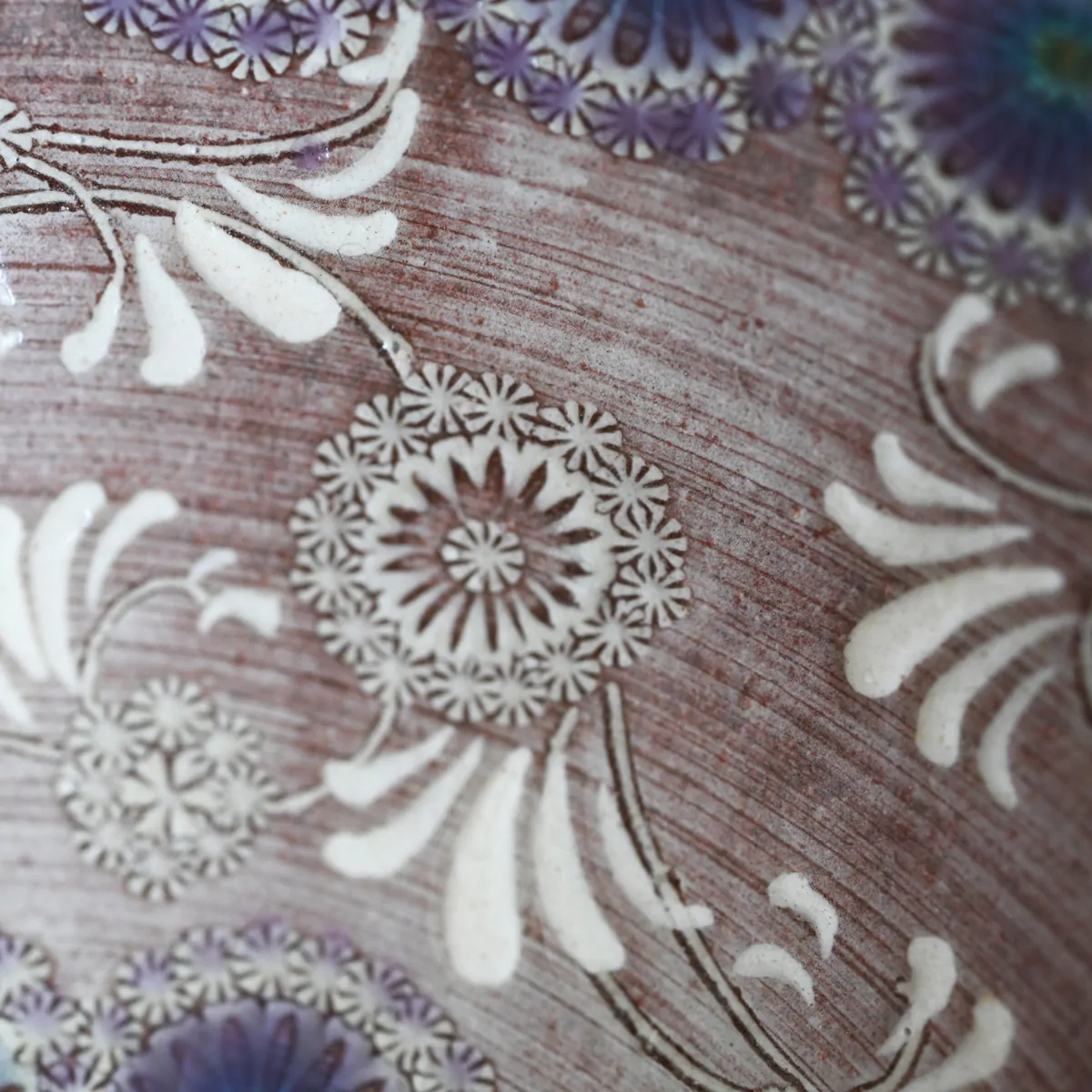 Hideo Morisato has developed a distinctive approach called “Murasaki Mishima” or “Shisaikamon,” named after the unique purple-hued clay used in their artworks. The designs are made with ceramic stamps, forming repeating patterns that give the piece a unique and dynamic look. Alongside the inlaid motifs, the bowl features “Ukihanamon”—bulging flower patterns—painted with white “Deisho” slip.