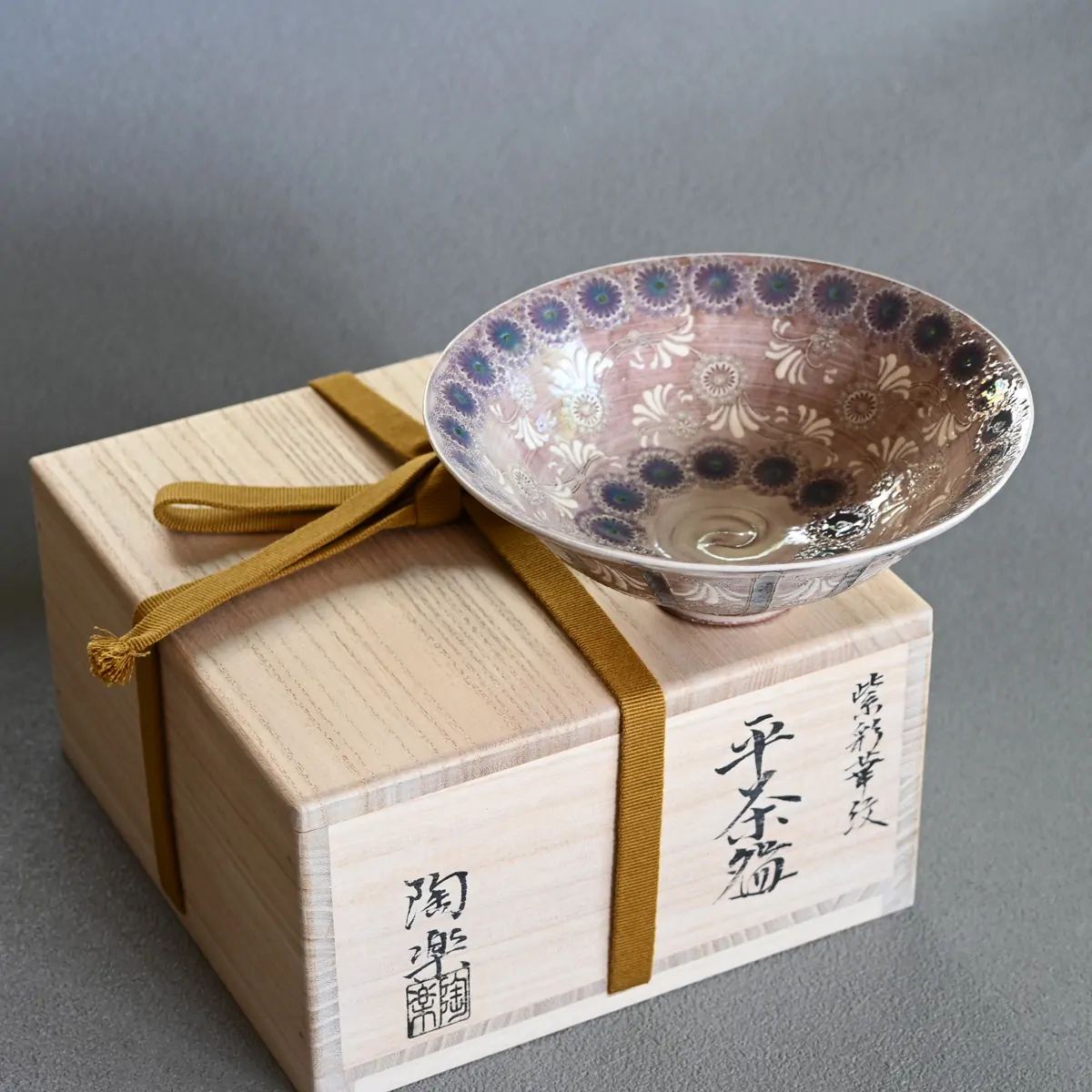 Hand-crafted by Hideo Morisato, the third-generation master of the Tōraku kiln, this tea bowl showcases the kiln's unique use of the Mishima technique, a traditional form of inlay decoration.