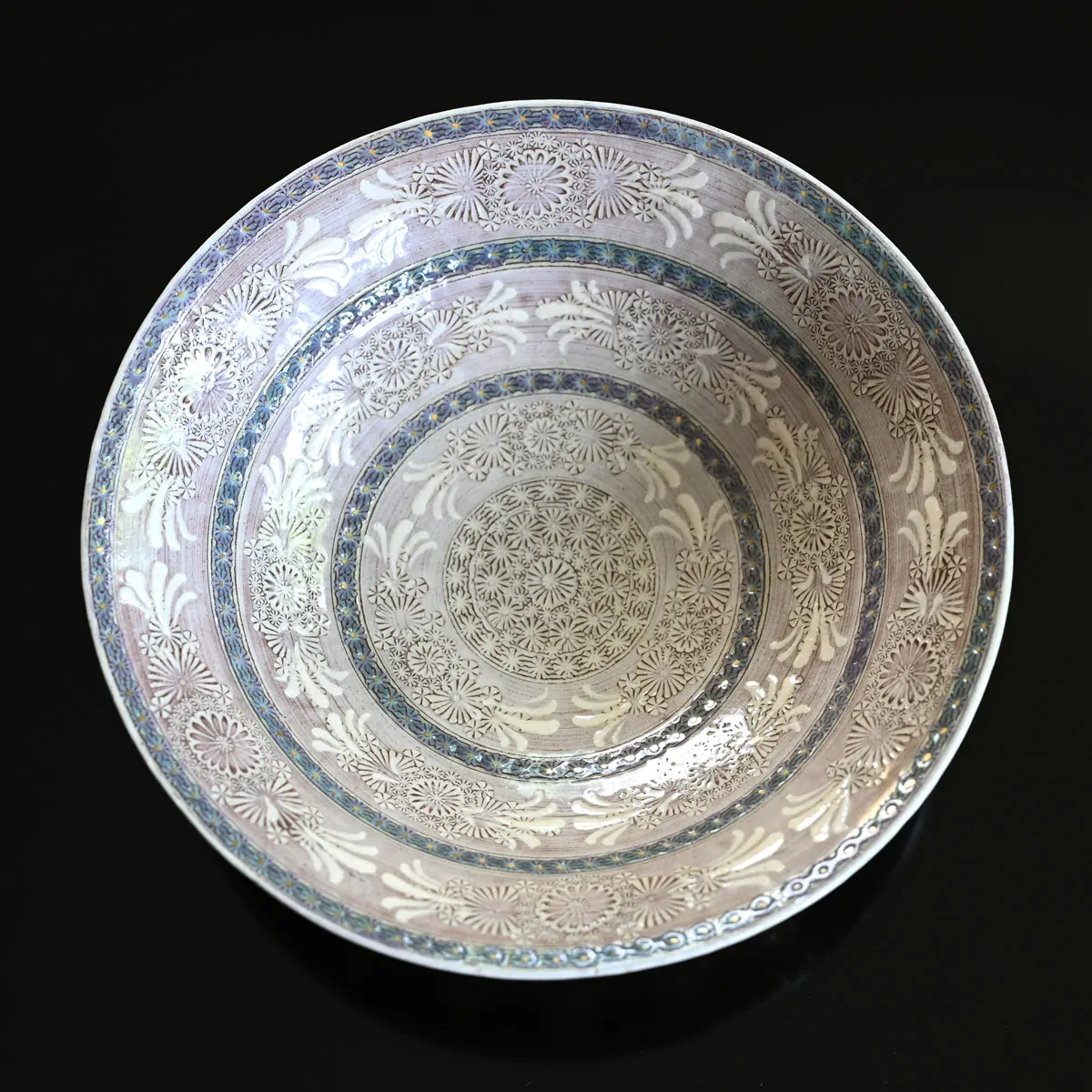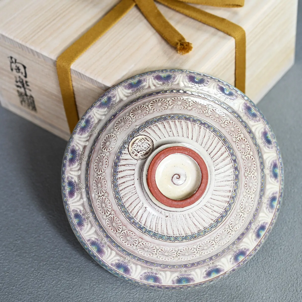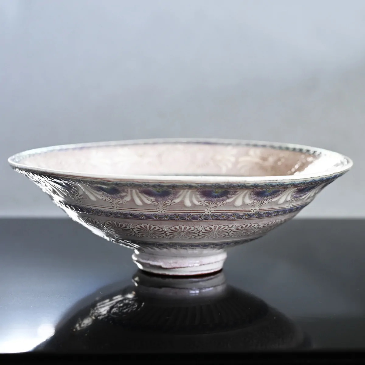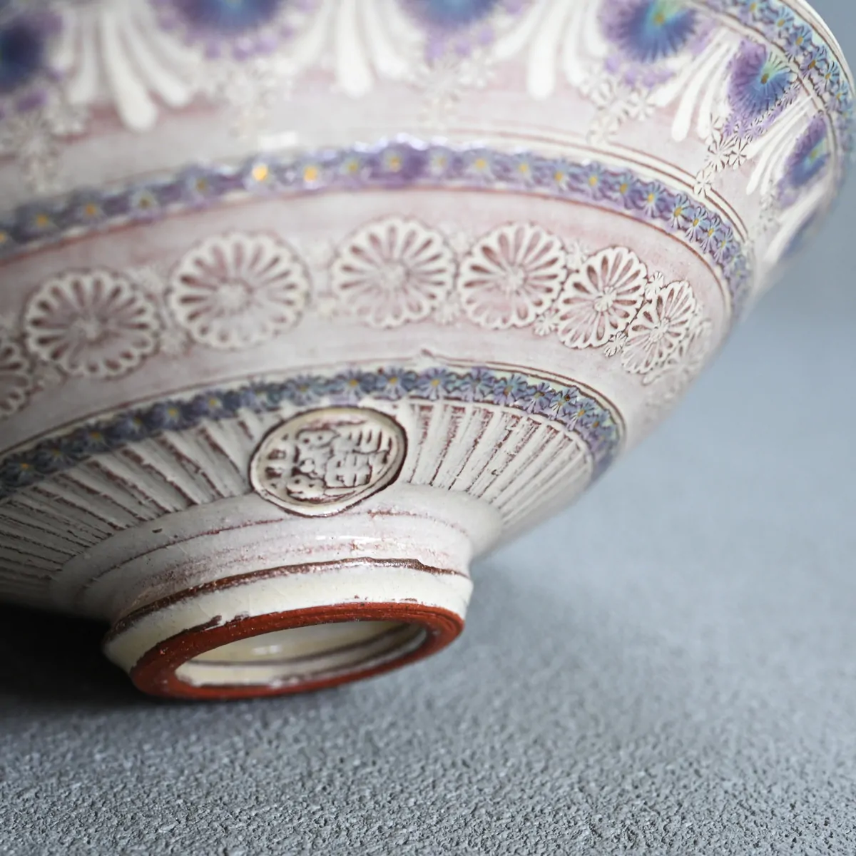 Hideo Morisato has developed a distinctive approach called “Murasaki Mishima” or “Shisaikamon,” named after the unique purple-hued clay used in their artworks. The designs are made with ceramic stamps, forming repeating patterns that give the piece a unique and dynamic look. Alongside the inlaid motifs, the bowl features “Ukihanamon”—bulging flower patterns—painted with white “Deisho” slip.