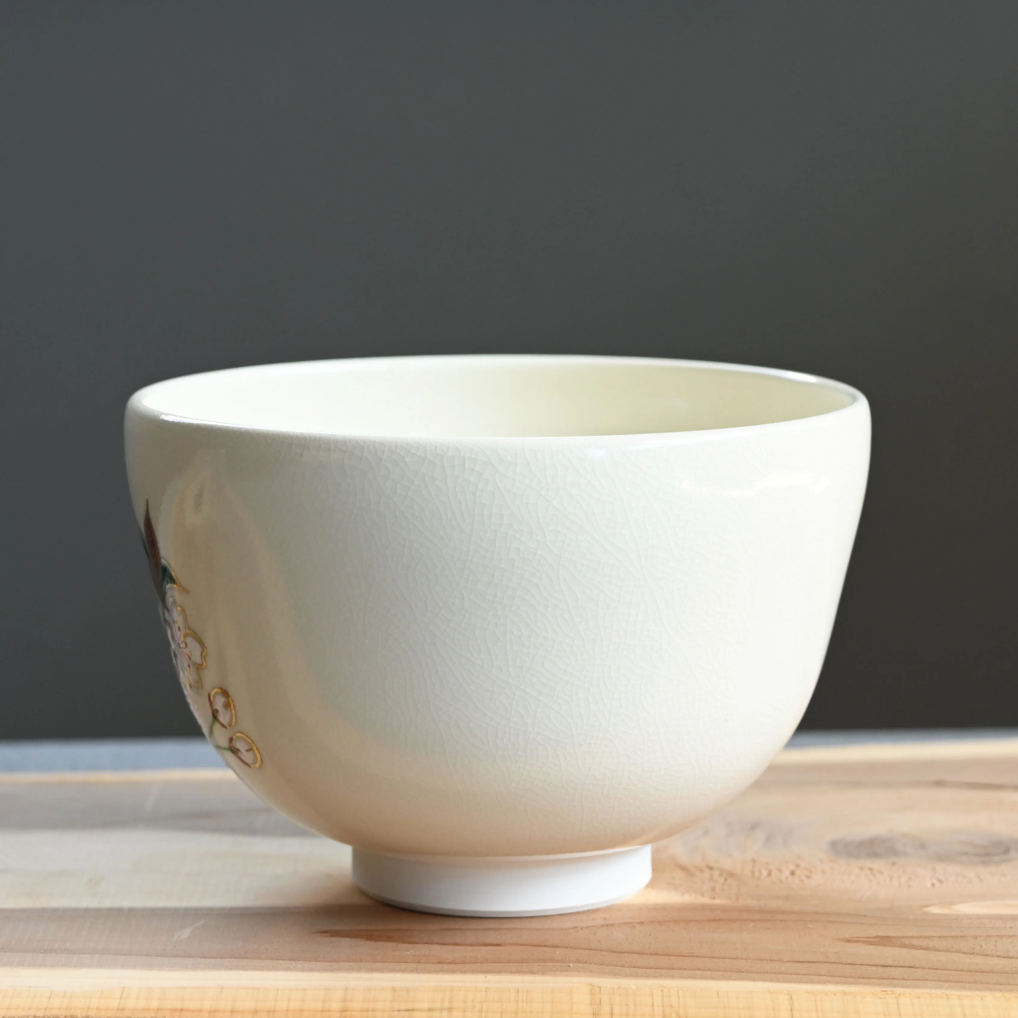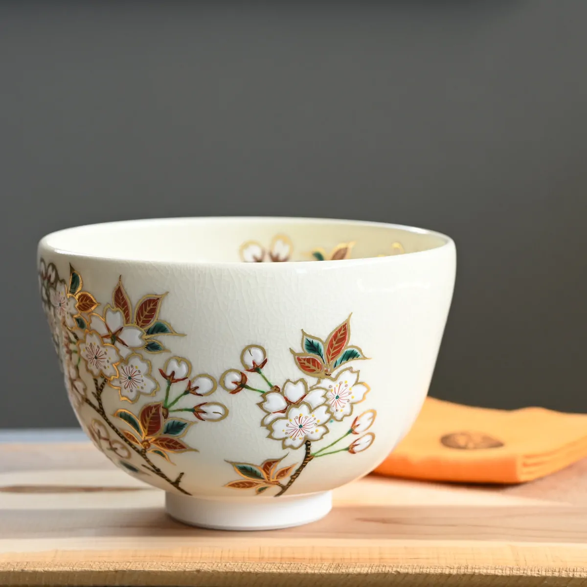 Kiyomizuyaki matcha tea bowl hand-painted with sakura blossom