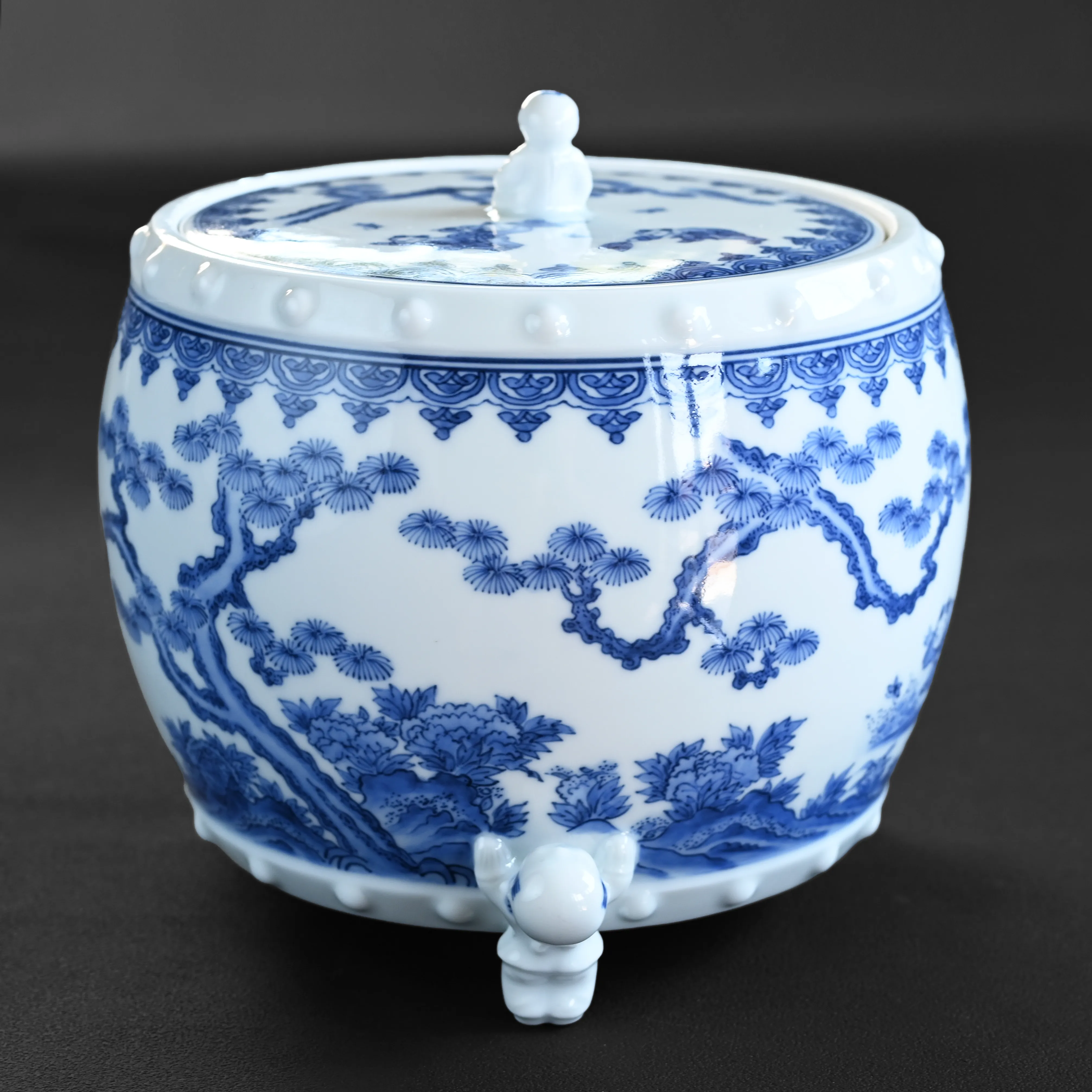 Exquisite handmade and hand-painted blue and white mizusashi. A mizusashi (“water container”) is a lidded vessel used in the Japanese tea ceremony. It holds fresh, cold water that the host uses to replenish the kettle and to rinse utensils during the ceremony.