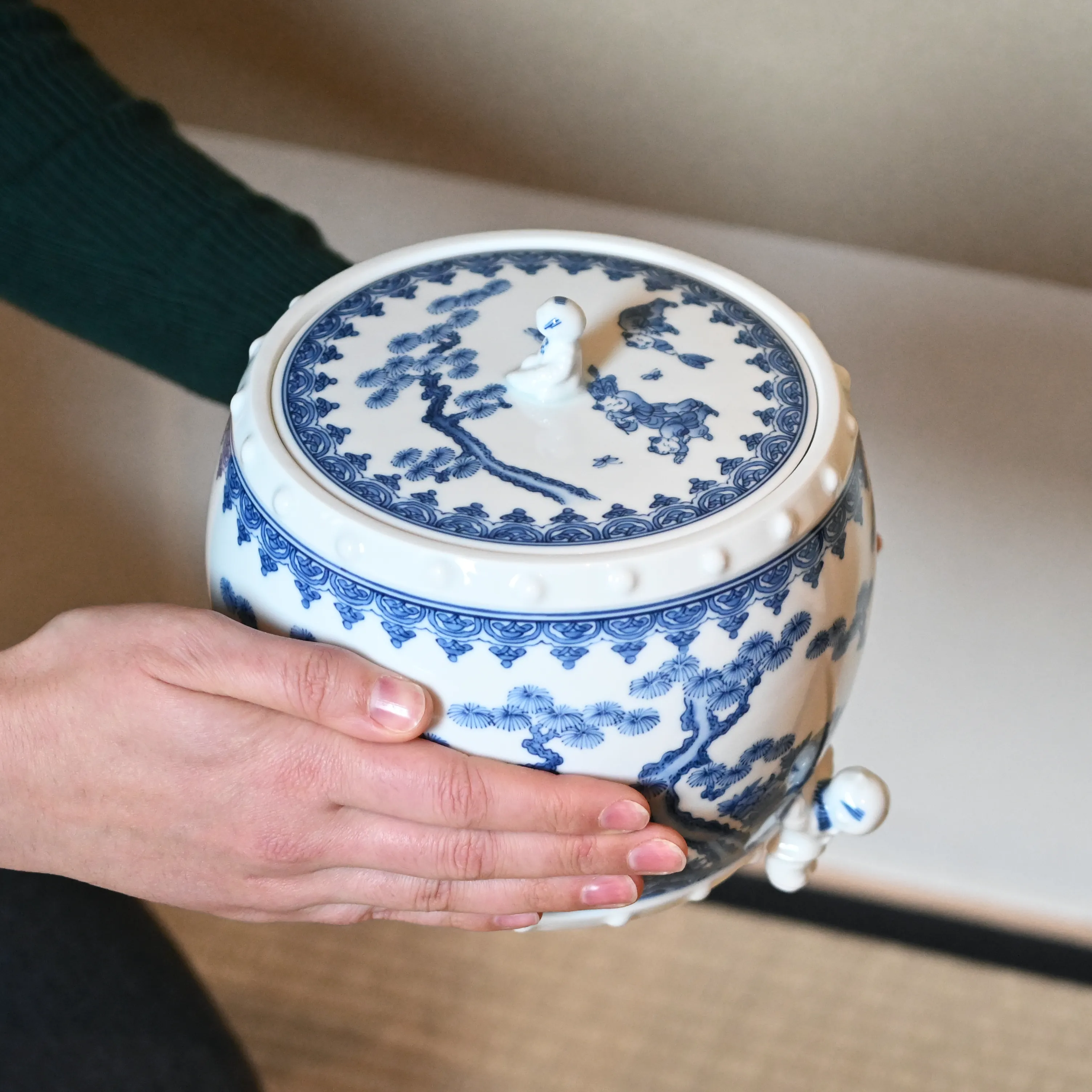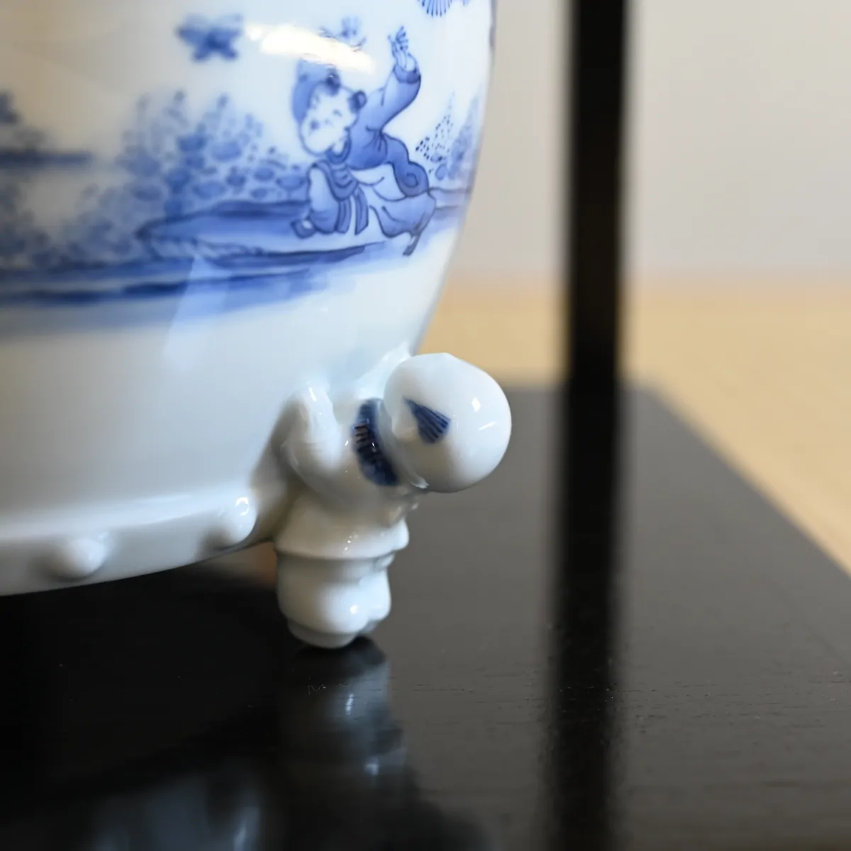 The mizusashi features scenes of playful children, a motif rooted in Chinese symbolism. During the Ming Dynasty - a time marked by war and invasions from outside tribes - constant conflict led to a significant drop in the population. As a result, children came to be deeply cherished. The term karako, meaning "Tang child," became a symbol of innocence and good fortune, and images of children grew popular as hopeful, lucky motifs.