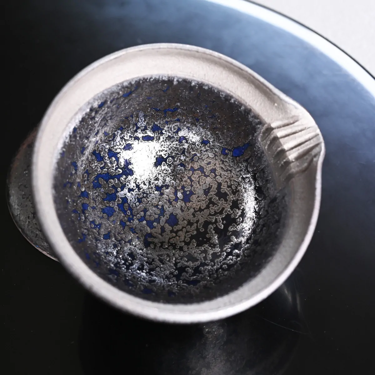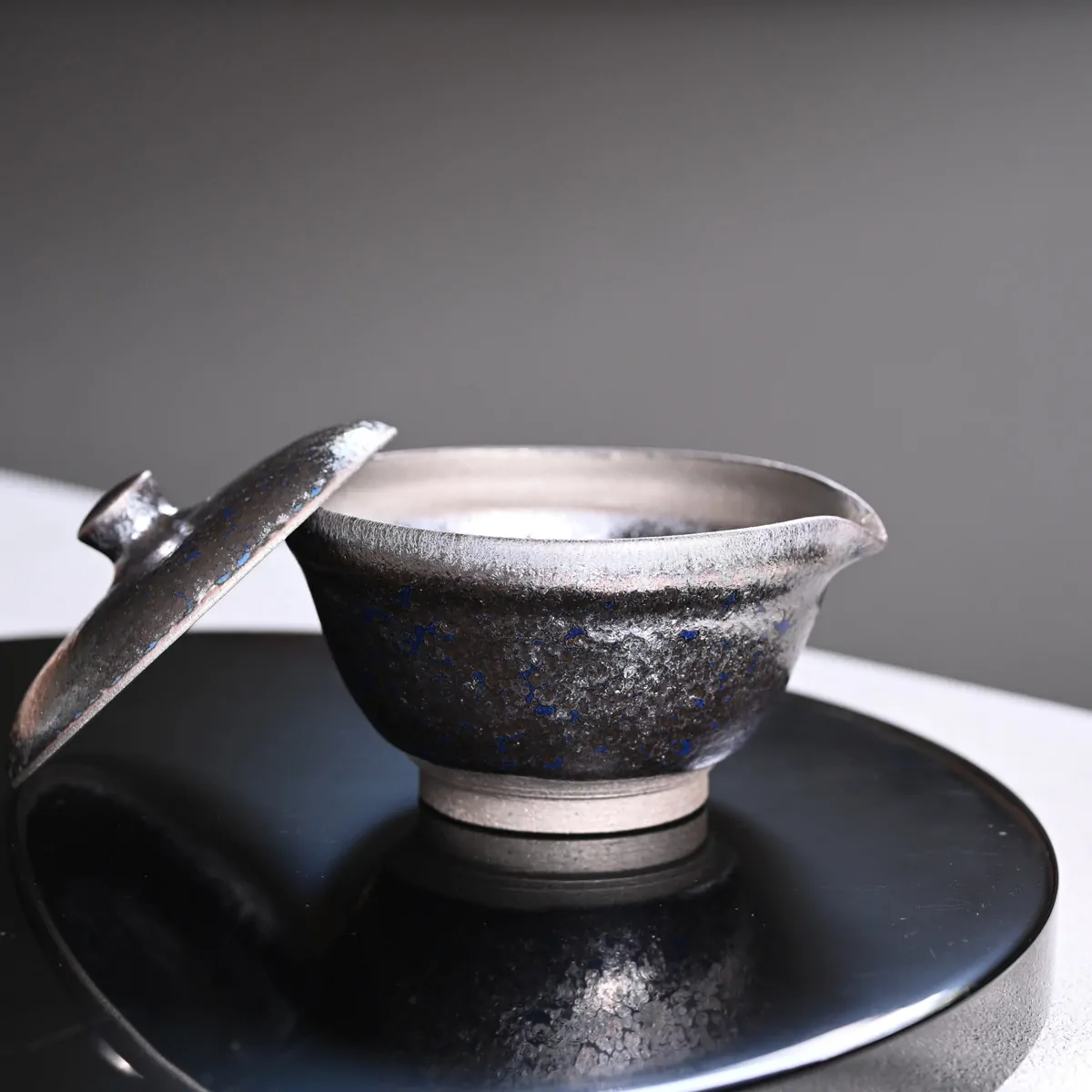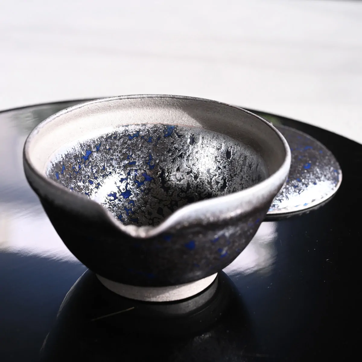 Yuteki Tenmoku glaze got its name from a remote Chinese temple it was first used, on the Tianmu (Tenmoku in Japanese and Heaven's Eye in English) Mountain. From the 13th century, monks in this temple drank their tea from tea bowls glazed with a special technique called yuteki (literally meaning “oil drop”). Tenmoku glazes can range in color and pattern, which makes every glazed piece unique with the impression of randomness, which has both aesthetic and philosophical appeal to the Japanese.