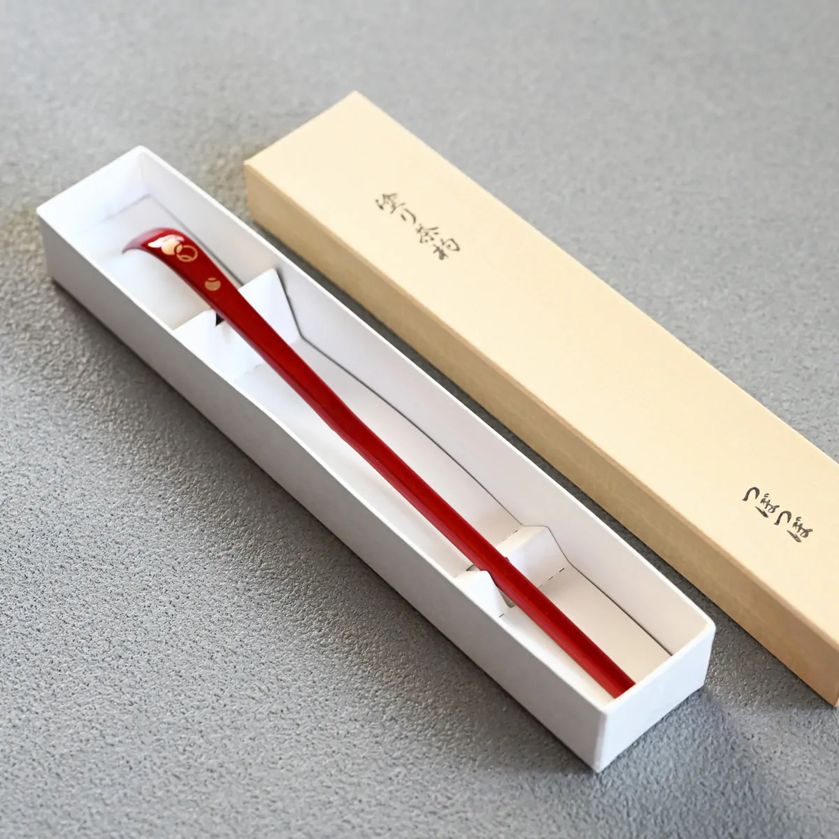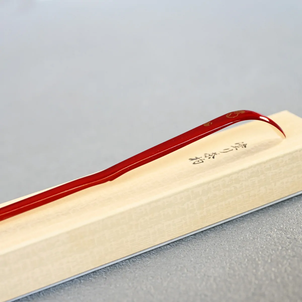 Bamboo tea scoop for matcha coated with red urushi lacquer and hand-painted with gold.