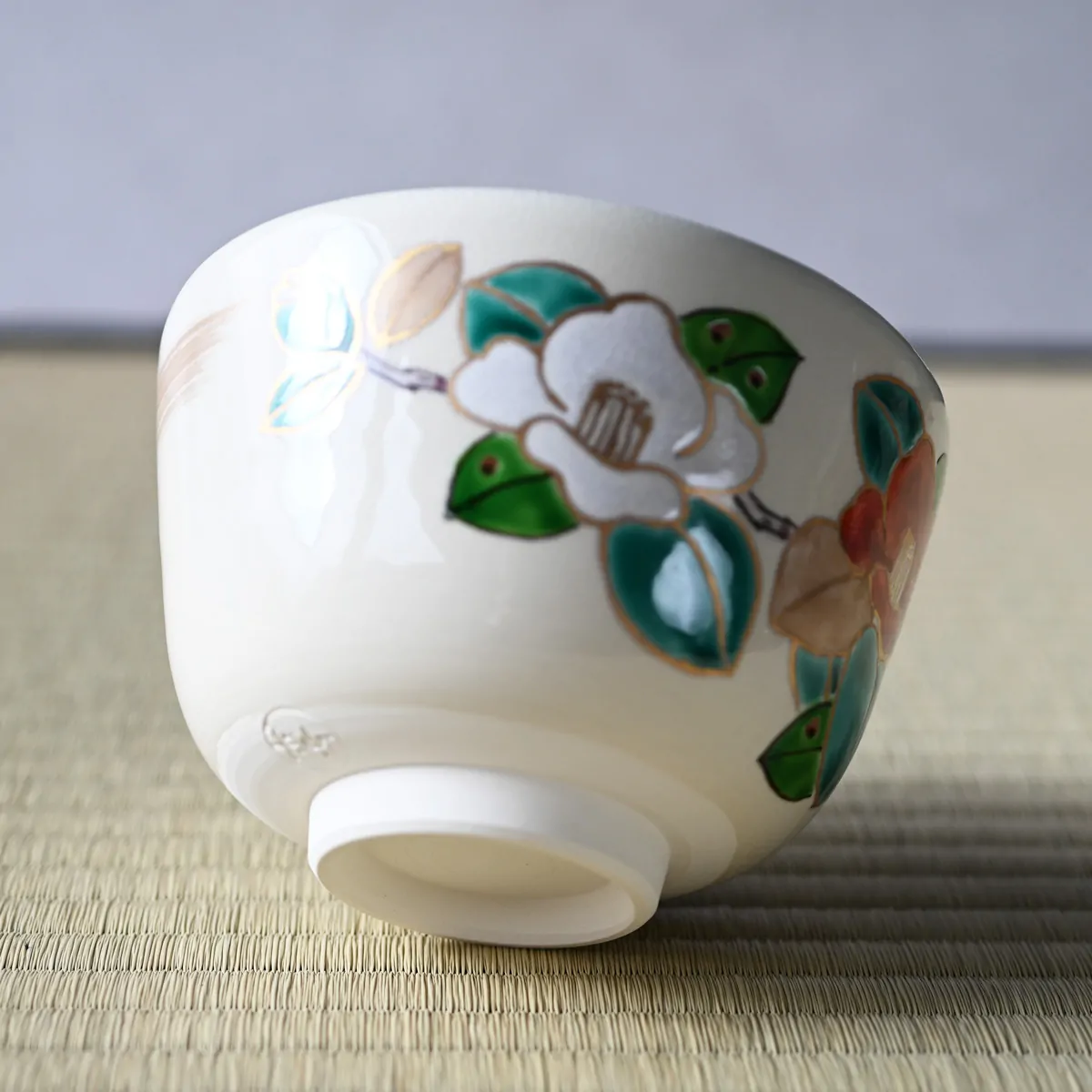 The tea bowl is decorated with hand-painted camellias ("tsubaki"). By the time the last autumn leaves fall in Japan, camellias erupt in all kinds of red, purple, and white, and bloom all winter, until mid spring. In Japan, they symbolize affection, devotion, and reunion with a loved one.