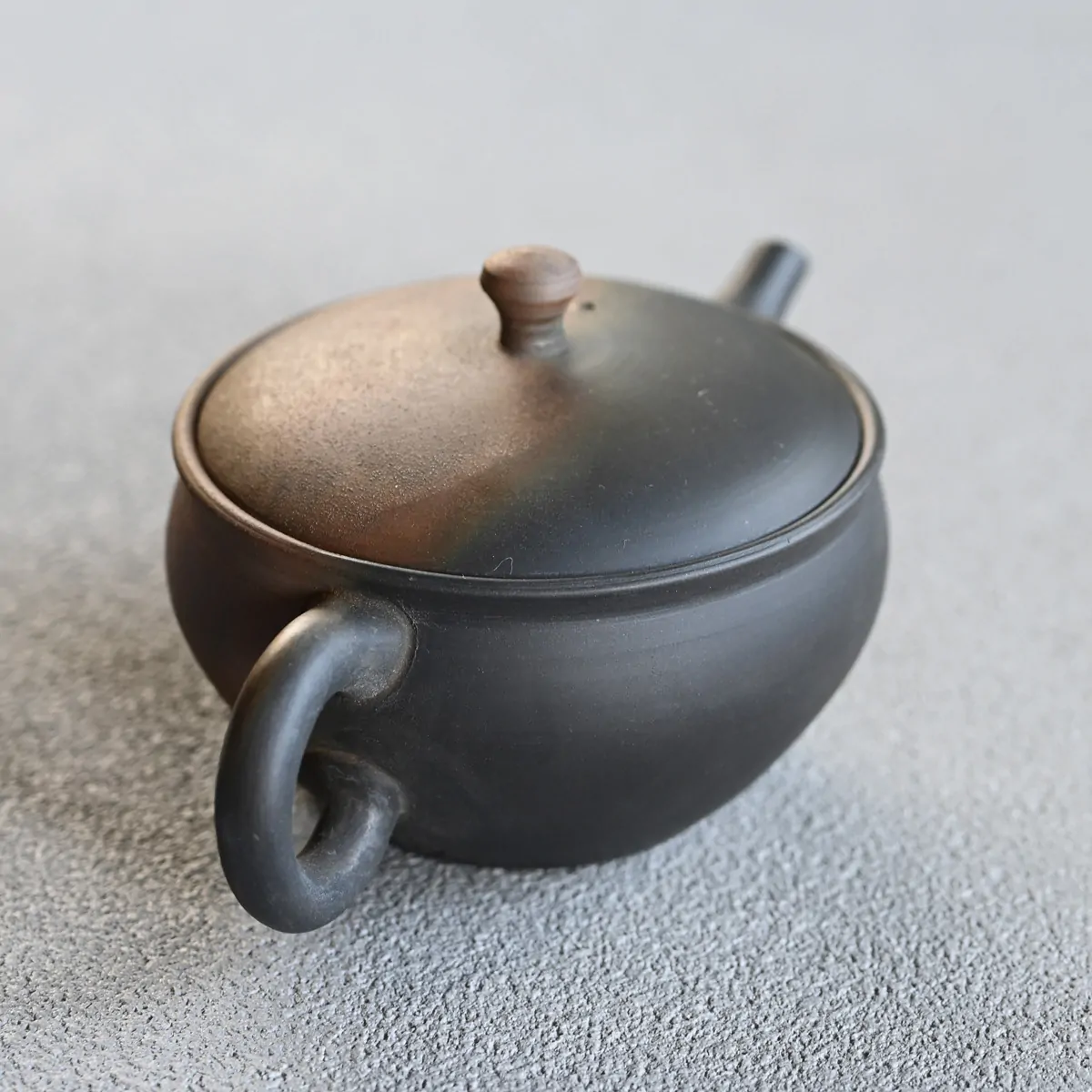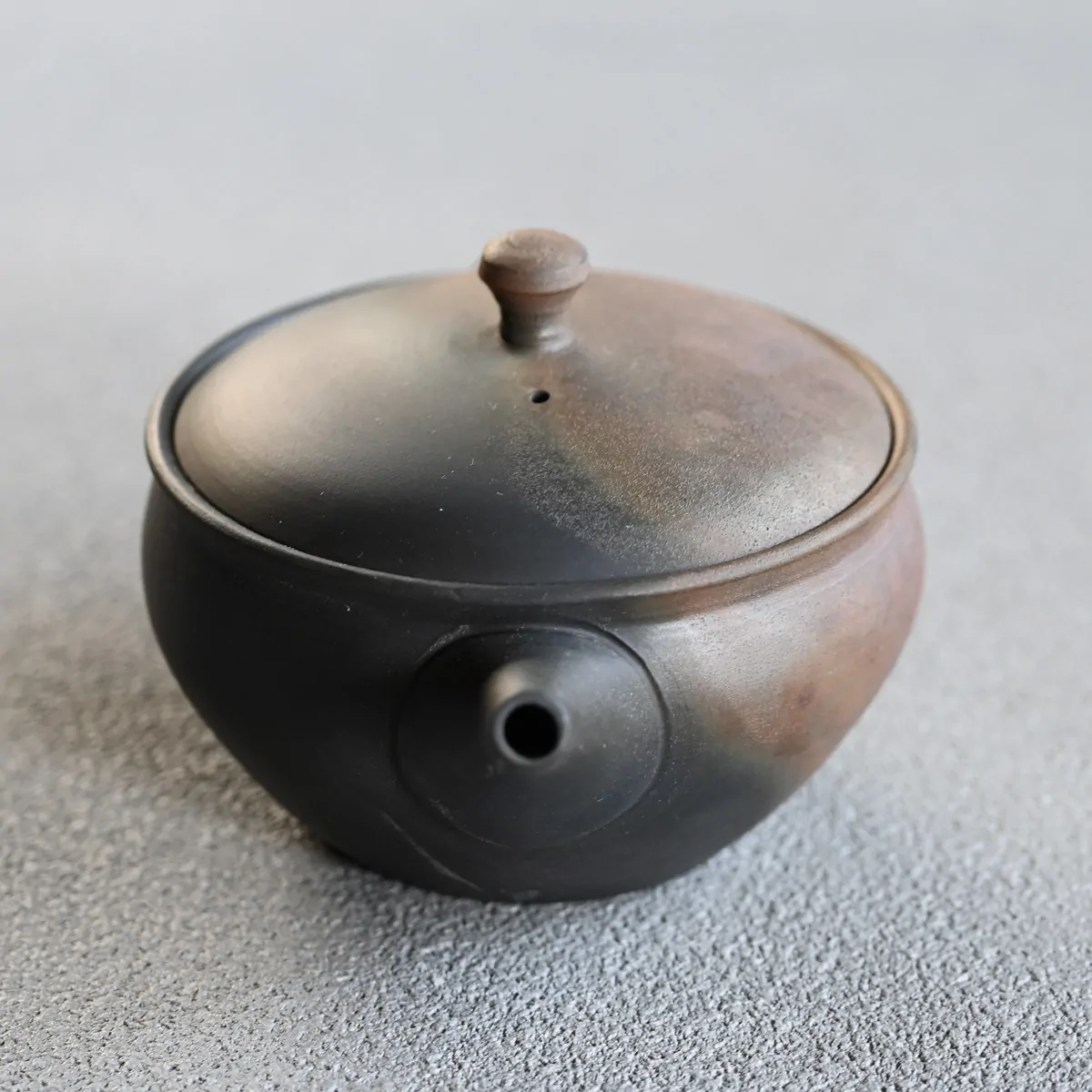 Handmade teapot fired in a reduction chamber, where the clay carbonizes and gives the surface a matte black patina. The reddish finish is thanks to the so-called "yōhen" which translates as "changed by the flame". When the teapot is fired, the heat fluctuates in the kiln, which results in color changes on the surface. This makes every piece unique with the impression of randomness, which has both aesthetic and philosophical appeal.
