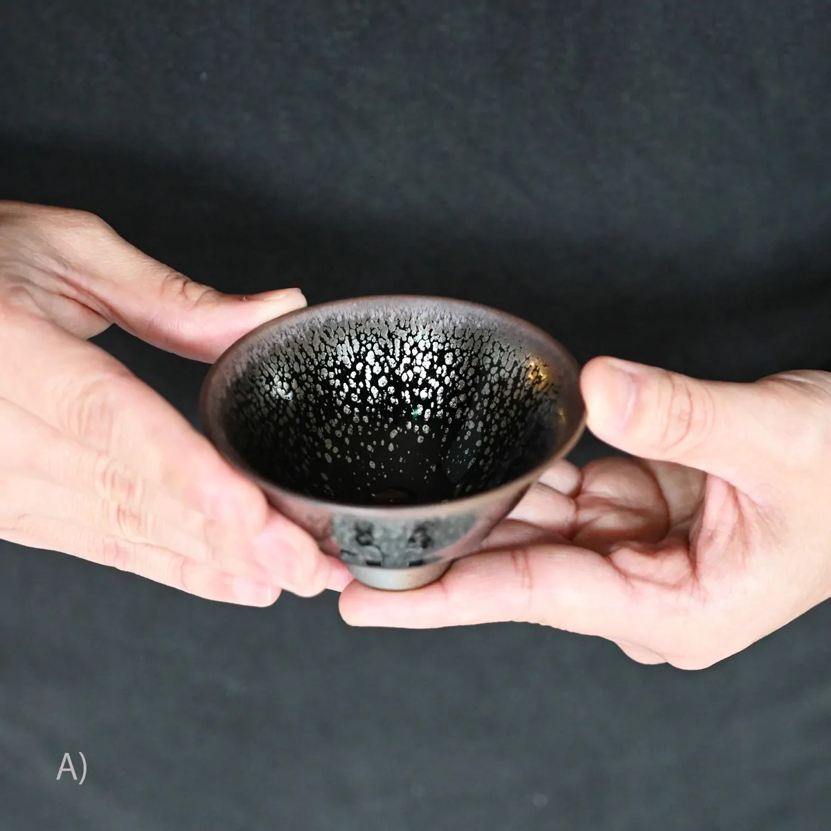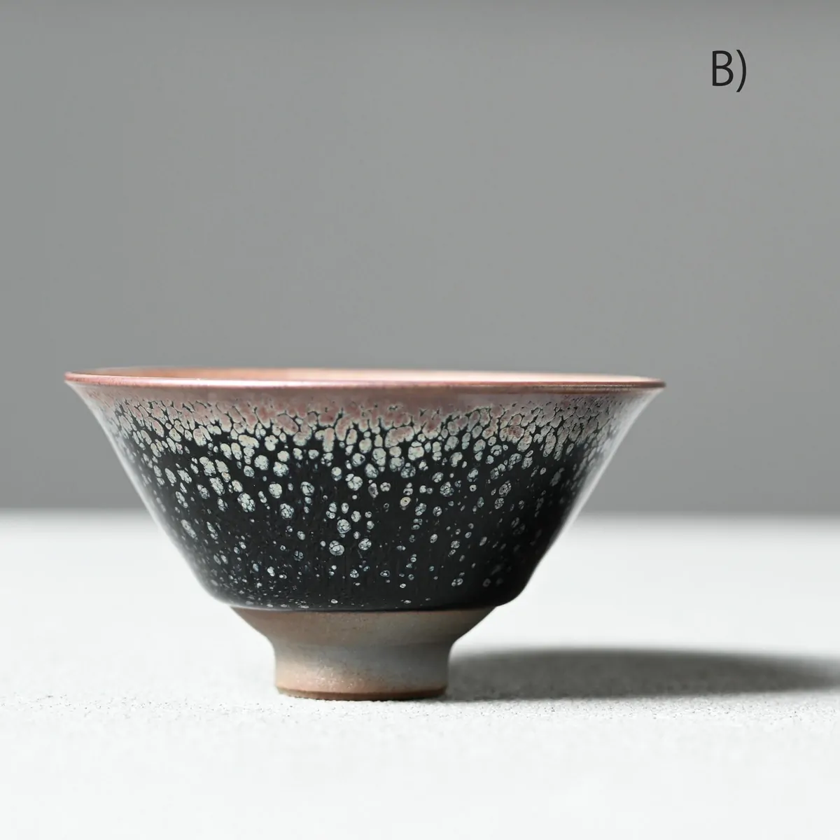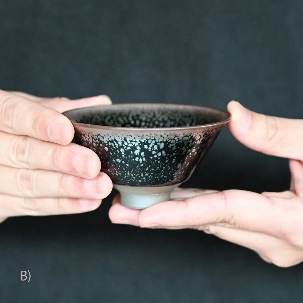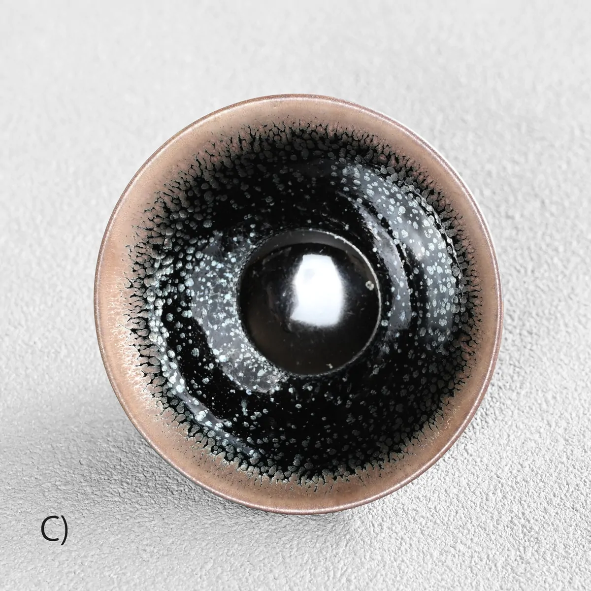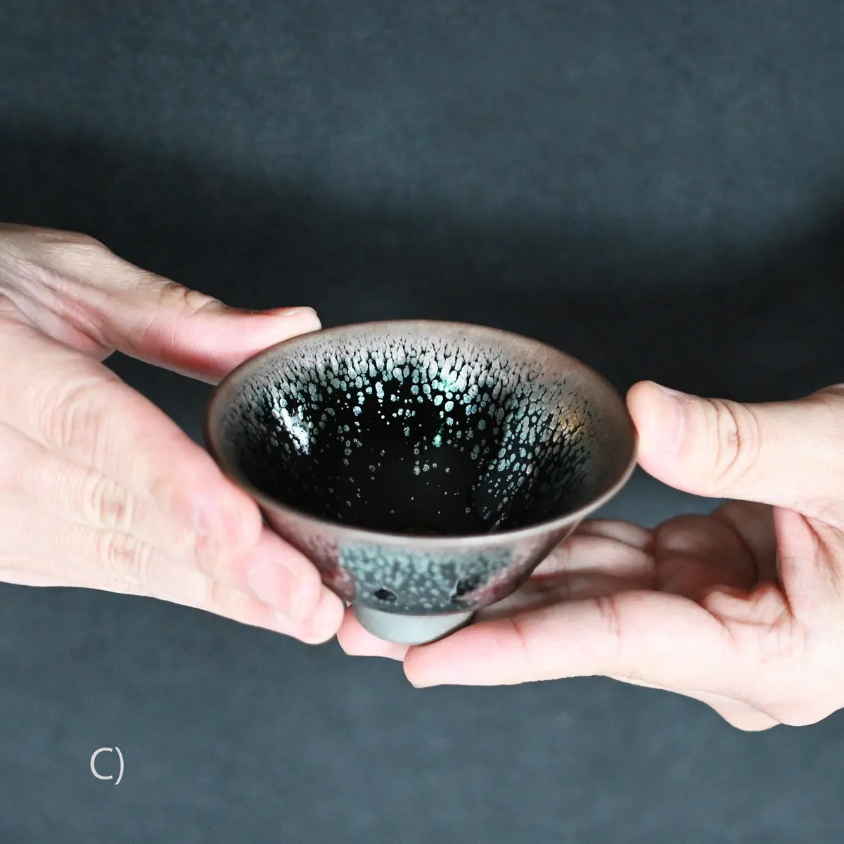 On our four available Kuro Yōhen Tenmoku cups the oil-drop glaze pattern varies slightly. You may choose between A, B, C, and D. (Please refer to the photos.) The measurements of the tea cups are identical.