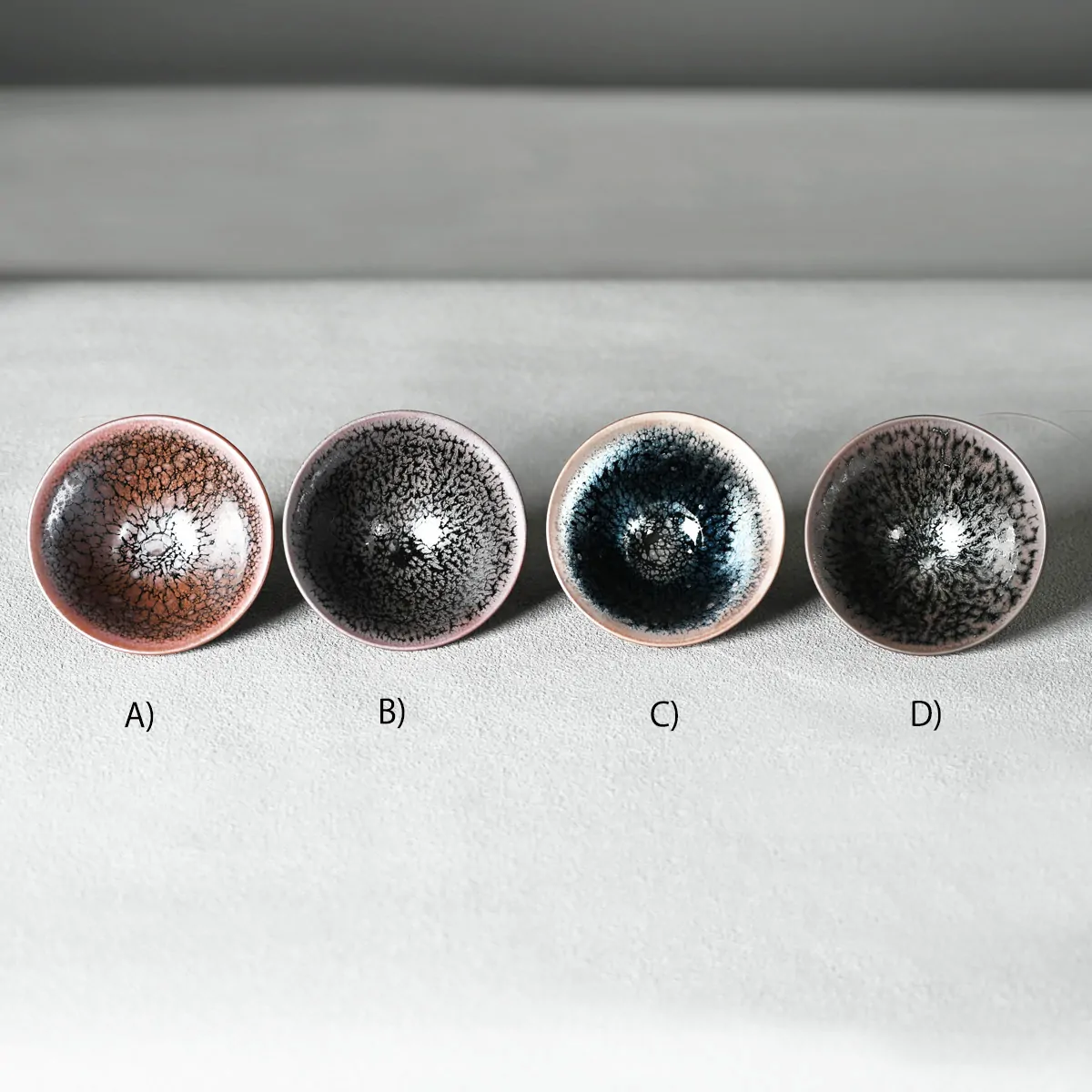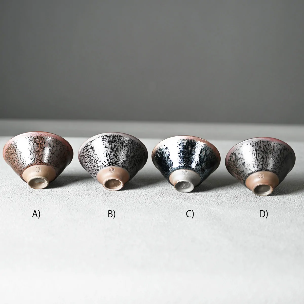On our four available Yōhen Tenmoku cups the oil-drop glaze pattern and color vary. You may choose between A, B, C, and D. (Please refer to the photos.) The measurements of the tea cups are identical.