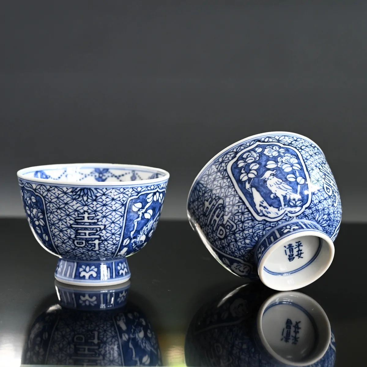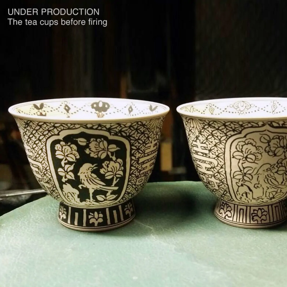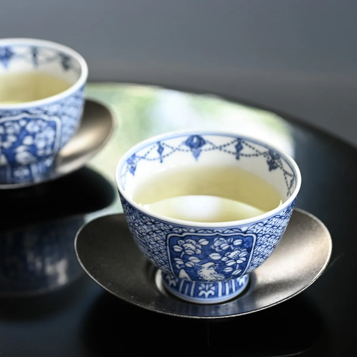 Kato Seishō works from his ceramic studio near Sennyū-ji Temple in Kyoto. The white porcelain base is crafted by his father, Seishō the Second, while the detailed painting and finishing are done by Seishō himself. The walls of the teacup are so delicately thin that, when held up to the light, the outer pattern becomes visible from within — a testament to the artisans’ remarkable skill.