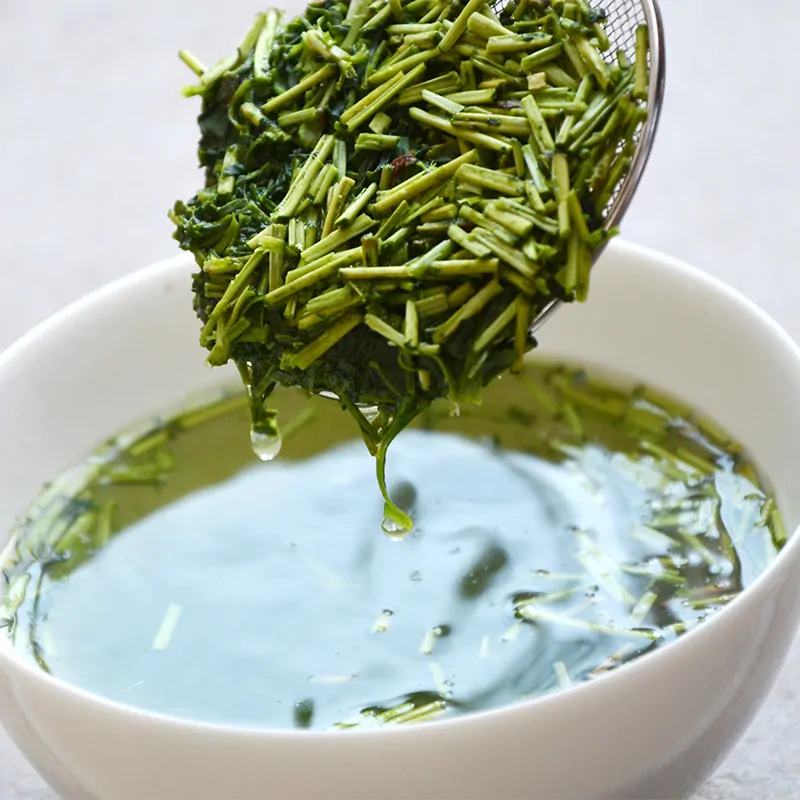 Karigane tea (or kukicha) is made of tea leaves and tea stems together. It contains more vitamin C than other types of green tea and has a savory, mellow taste.